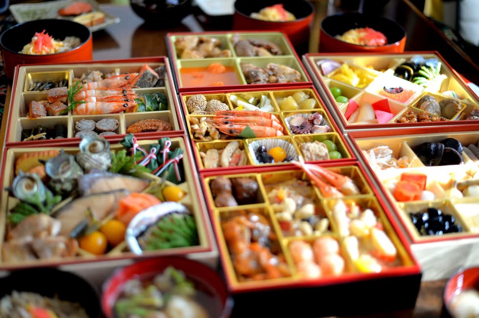お餅、揚げ物、甘い味付けおせち、煮物、だし巻き卵、栗きんとんなど、カロリーが高く糖質・脂質が多い料理が並びます。